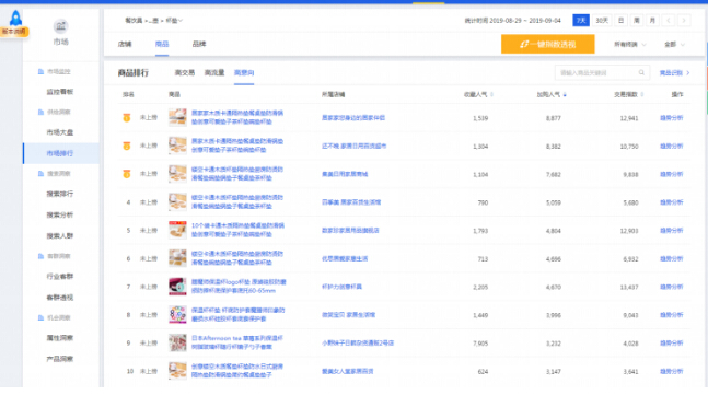 第一个方法是人气宝贝分析,通过【市场洞察】-【市场排行榜】-【商品】-【高意向】筛选后,可以找到在该品类下的全网高意向产品(收藏人气和加购人气较高的产品)。